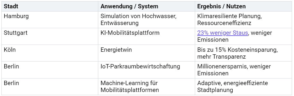 Städte setzen digitale Zwillinge ein, um Energie effizienter zu nutzen. Sie simulieren Hochwasserszenarien und optimieren Entwässerungssysteme, wie in Hamburg. In Stuttgart sorgt eine KI-Plattform für weniger Staus und geringeren Energieverbrauch. Der Kölner Energietwin hilft, kommunale Kosten zu senken und Transparenz zu schaffen. Berlin nutzt IoT-Geräte, um Parkflächen besser zu bewirtschaften und Emissionen zu reduzieren.