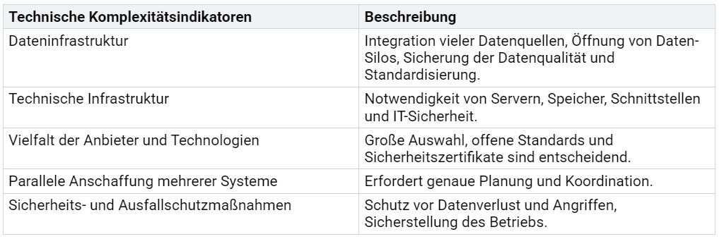 Digitale Zwillinge stellen Städte vor große technische Herausforderungen. Die Integration verschiedener Datenquellen erfordert eine stabile und flexible Dateninfrastruktur. Viele Systeme müssen miteinander kommunizieren. Unterschiedliche Anbieter und Technologien erschweren die Auswahl und den Aufbau. Die folgende Tabelle zeigt wichtige technische Komplexitätsindikatoren:
