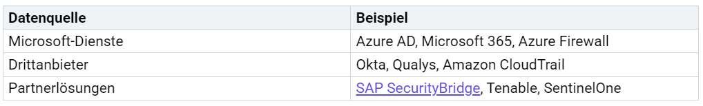 Du kannst Daten aus Microsoft-Diensten wie Azure AD, Microsoft 365 und Azure Firewall einbinden. Auch Drittanbieter wie Okta oder Amazon CloudTrail lassen sich integrieren. Die Plattform unterstützt viele verschiedene Quellen.