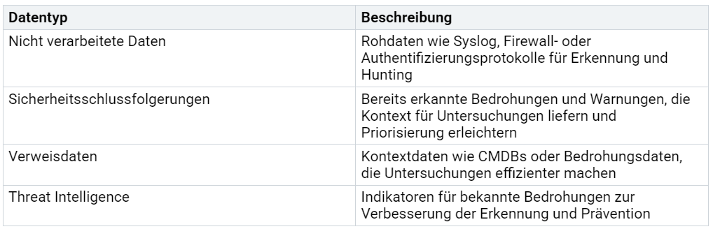 Die wichtigsten Datentypen, die Microsoft Sentinel verarbeitet, findest du in dieser Übersicht: