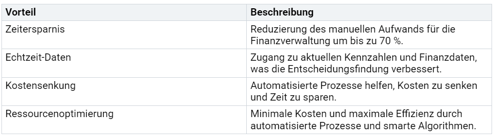 KI hilft dir, schneller Antworten auf Anfragen zu erhalten und komplexe Prozesse zu vereinfachen. Sie kann Muster in Daten erkennen und Vorhersagen treffen, die die Entscheidungsfindung verbessern. In der Finanzverwaltung reduziert KI den manuellen Aufwand und steigert die Effizienz.
