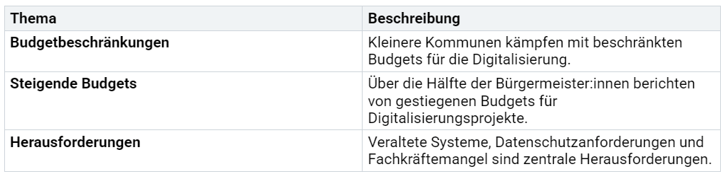 Die Finanzierung der Digitalisierung stellt viele Kommunen vor große Herausforderungen. Du siehst oft, dass kleinere Gemeinden mit begrenzten Budgets kämpfen. Gleichzeitig steigen die Kosten für moderne Technologien und IT-Infrastruktur. Über die Hälfte der Bürgermeister:innen berichtet jedoch von gestiegenen Budgets für Digitalisierungsprojekte. Dies zeigt, dass die Bedeutung der digitalen Transformation erkannt wird.