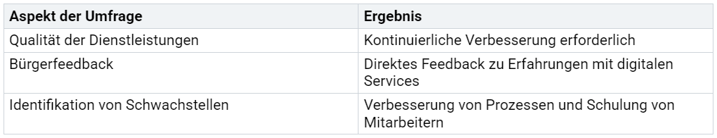 Eine Umfrage zeigt, dass die Zufriedenheit mit E-Government-Angeboten in Deutschland gestiegen ist. Bürger schätzen die Möglichkeit, direktes Feedback zu digitalen Services zu geben. Dieses Feedback hilft, Schwachstellen zu identifizieren und Prozesse zu verbessern. Gleichzeitig werden Mitarbeiter gezielt geschult, um dir einen besseren Service zu bieten.