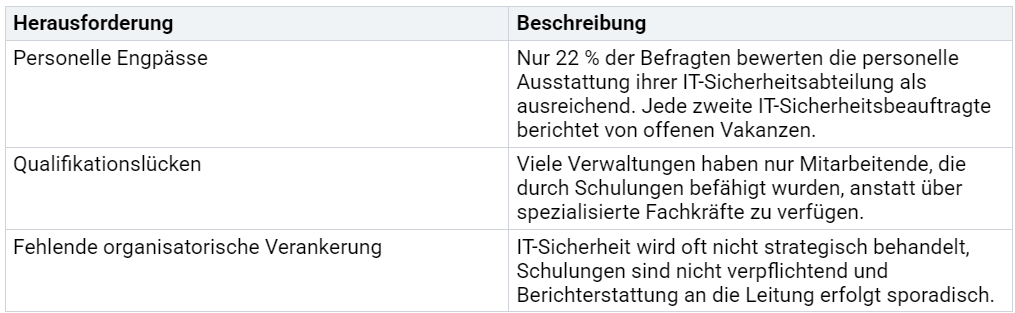 Ein häufiges Problem ist die personelle Ausstattung. Nur 22 % der Befragten bewerten die personelle Ausstattung ihrer IT-Sicherheitsabteilung als ausreichend. Jede zweite IT-Sicherheitsbeauftragte berichtet von offenen Stellen. Viele Verwaltungen setzen auf Mitarbeitende, die durch Schulungen befähigt wurden, anstatt auf spezialisierte Fachkräfte.