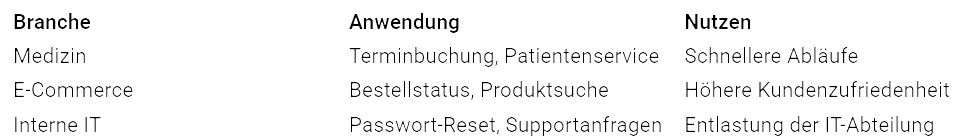 Unternehmen setzen Chatbots in Bereichen wie Kundenservice, Wetterdiensten oder internen Prozessen ein.