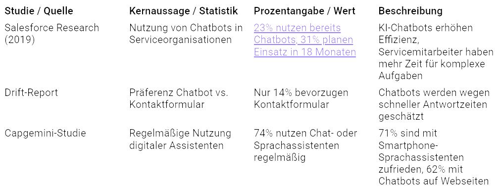 Chatbots und Künstliche Intelligenz unterscheiden sich in ihrer Funktion. Ein Chatbot ist das sichtbare System, das mit Menschen spricht. Künstliche Intelligenz bildet das „Gehirn“ im Hintergrund. Sie ermöglicht es dem Chatbot, Sprache zu verstehen und zu lernen. Die folgende Tabelle zeigt, wie verbreitet Chatbots heute sind: