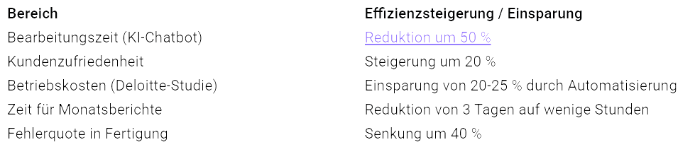 Unternehmen profitieren von einer höheren Effizienz durch den Einsatz von KI-Chatbots. Sie sparen Zeit und Kosten, da viele Aufgaben automatisch ablaufen. Die folgende Tabelle zeigt konkrete Verbesserungen in verschiedenen Bereichen: