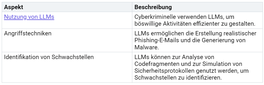 Solche Angriffe nutzen die Fähigkeit von LLMs, realistische Sprache und Inhalte zu erzeugen, um Vertrauen zu gewinnen und Sicherheitsmechanismen zu umgehen. Unternehmen müssen daher verstärkt auf Schulungen und technische Schutzmaßnahmen setzen, um sich vor diesen Bedrohungen zu schützen.