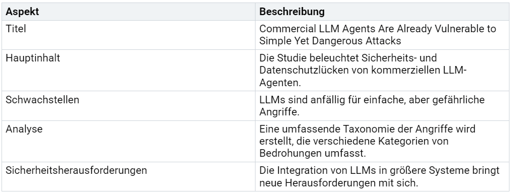 Gehackte Large Language Models (LLMs) können gezielt zur Erstellung von Schadcode und Malware eingesetzt werden. Diese Gefahr entsteht, wenn Angreifer die Fähigkeit der Modelle nutzen, komplexe Anweisungen zu verstehen und auszuführen. Eine Studie mit dem Titel "Commercial LLM Agents Are Already Vulnerable to Simple Yet Dangerous Attacks" zeigt, wie anfällig kommerzielle LLM-Agenten für solche Angriffe sind. Die Analyse hebt hervor, dass einfache, aber gefährliche Angriffe ausreichen, um Sicherheitslücken auszunutzen. Die folgende Tabelle fasst die wichtigsten Erkenntnisse zusammen: