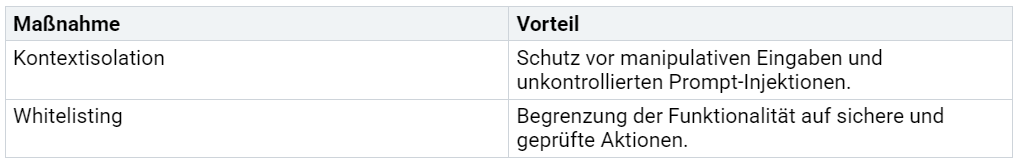 Kontextisolation und Whitelisting sind essenzielle Maßnahmen, um die Sicherheit von LLMs zu erhöhen. Kontextisolation trennt die Eingaben der Nutzer strikt vom internen Systemkontext. Dadurch wird verhindert, dass schädliche Eingaben unkontrolliert in den Prompt des Modells gelangen.