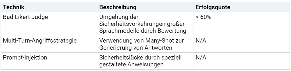 Die Erfolgsquote dieser Angriffe hängt stark von der Sicherheitsarchitektur des Modells ab. Eine Tabelle zeigt die Effektivität verschiedener Techniken: