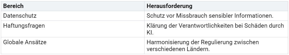 Globale Ansätze: Unterschiedliche Länder entwickeln eigene Strategien zur Regulierung von KI, was internationale Zusammenarbeit erfordert.