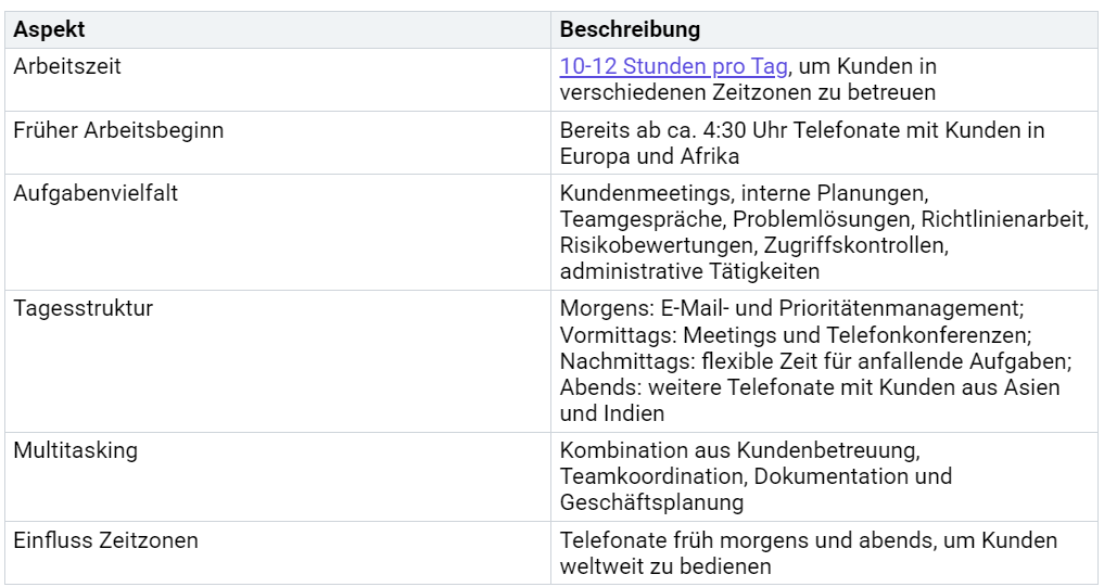 Meetings bestimmen einen großen Teil deines Alltags. Morgens stehen oft Telefonate mit Kunden aus Europa oder Afrika an. Im Laufe des Tages folgen interne Besprechungen, Team-Updates und Planungsrunden. Du sprichst mit IT-Teams, Management und manchmal auch mit externen Partnern. Die Aufgaben sind vielfältig: Von der Abstimmung über Sicherheitsrichtlinien bis zur Planung von Notfallübungen ist alles dabei.