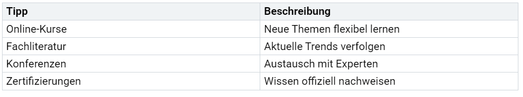 Merke: Weiterbildung und Networking sind Schlüssel zum Erfolg. Nutze Konferenzen, Online-Kurse und Fachgruppen, um dein Wissen zu erweitern.