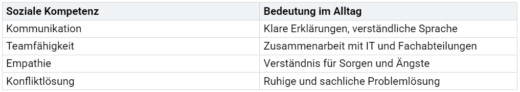 Technik allein reicht nicht. Du arbeitest mit Menschen aus verschiedenen Abteilungen und erklärst komplexe Themen verständlich. Gute Kommunikation hilft dir, Vertrauen aufzubauen und Teams zu motivieren.