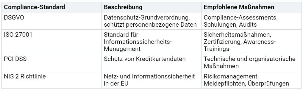 Hier ein Überblick über wichtige Compliance-Standards und Maßnahmen: